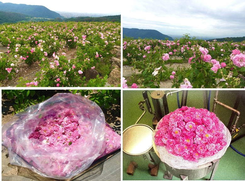山梨農場では6,000株のダマスクローズ・Rosa damascenaを完全無農薬で栽培して、5月下旬から6月中旬に収穫して蒸留します。100kgの花から約240ℓのローズウォーターが作られます。